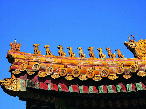 屋脊上的脊獸,共有十種,分別是龍、鳳、獅子、天馬、海馬、狎魚、狻猊、獬豸、斗牛和行什。脊獸的數(shù)量和建筑的等級有關(guān)系,從字面意思看,脊獸主要分為騎鳳仙人和走獸兩部分,而每一個走獸都有自己的名字和意味,每一個小獸都有他們自己的來源及意義,同時脊獸可不是只有裝飾和寄托人們美好愿望那么簡單,這些脊獸非常重要,因為它們是關(guān)系著建筑的穩(wěn)定性。